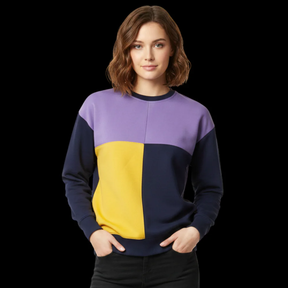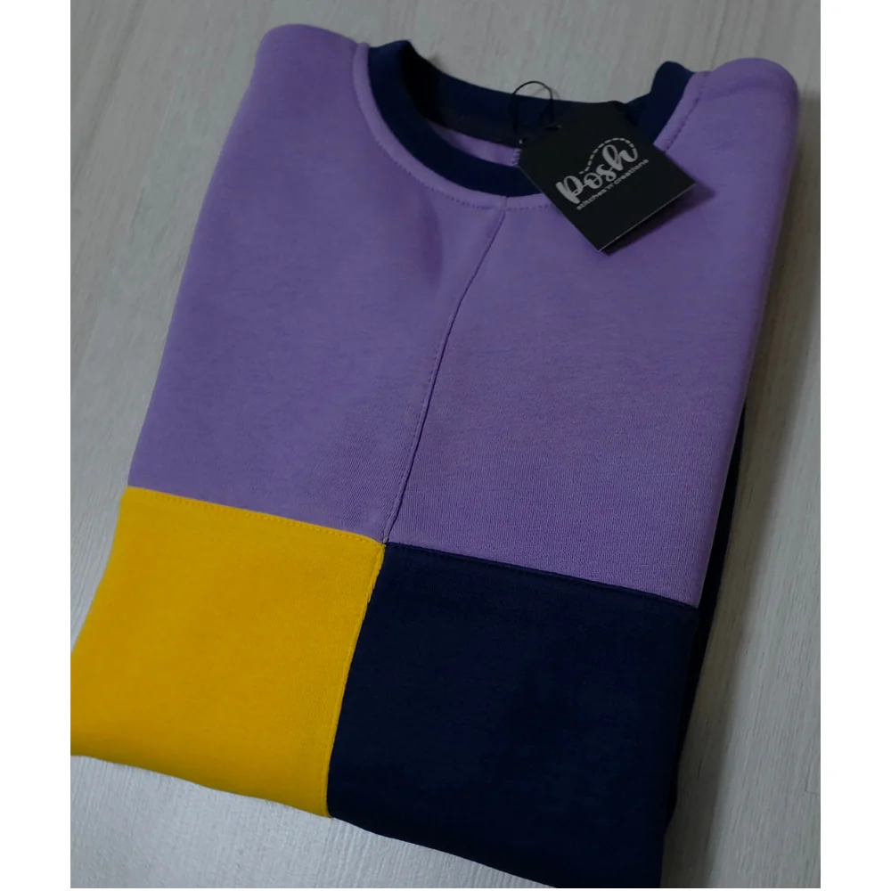 This color-block crewneck sweatshirt is made to stand out. With its striking mix of Purple, navy, and mustard. It brings instant personality to any outfit. The soft, premium fabric feels as good as it looks, while the relaxed fit gives you all-day comfort without sacrificing style.