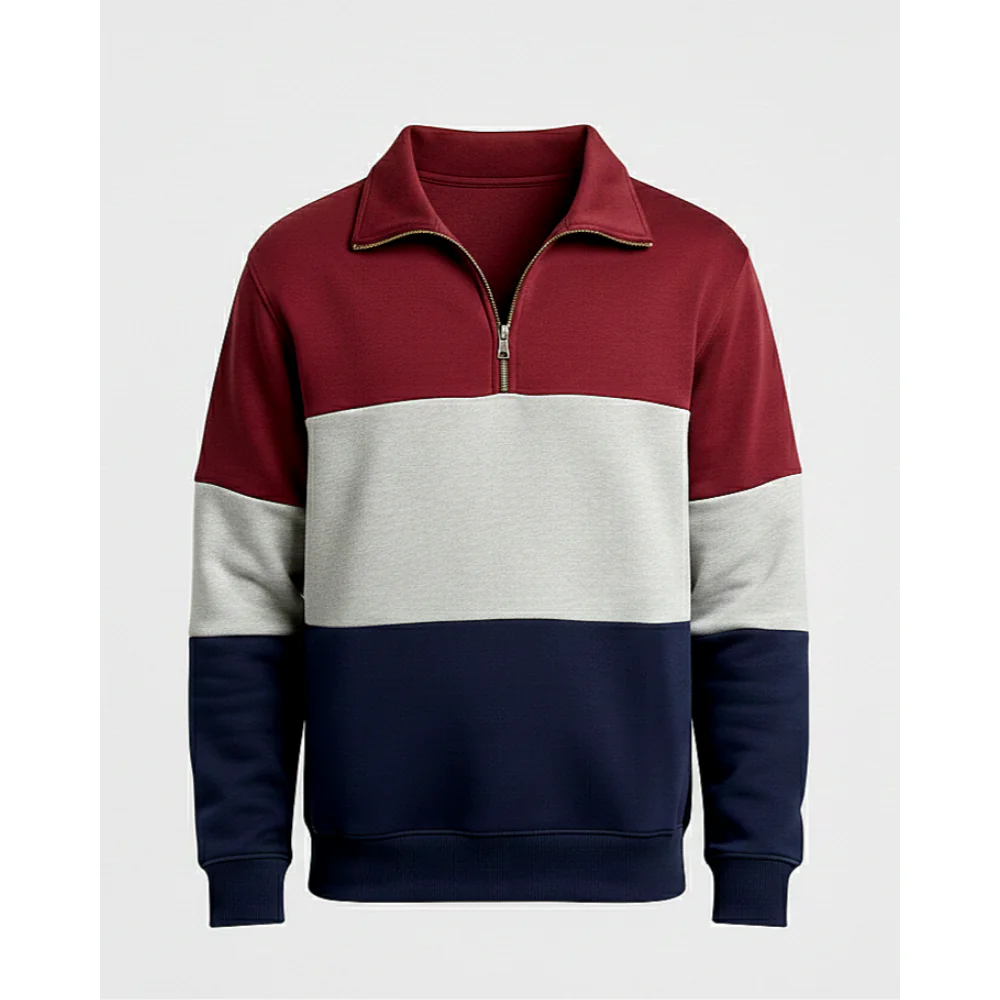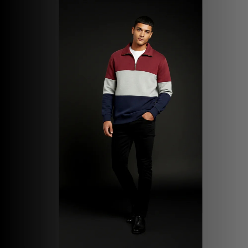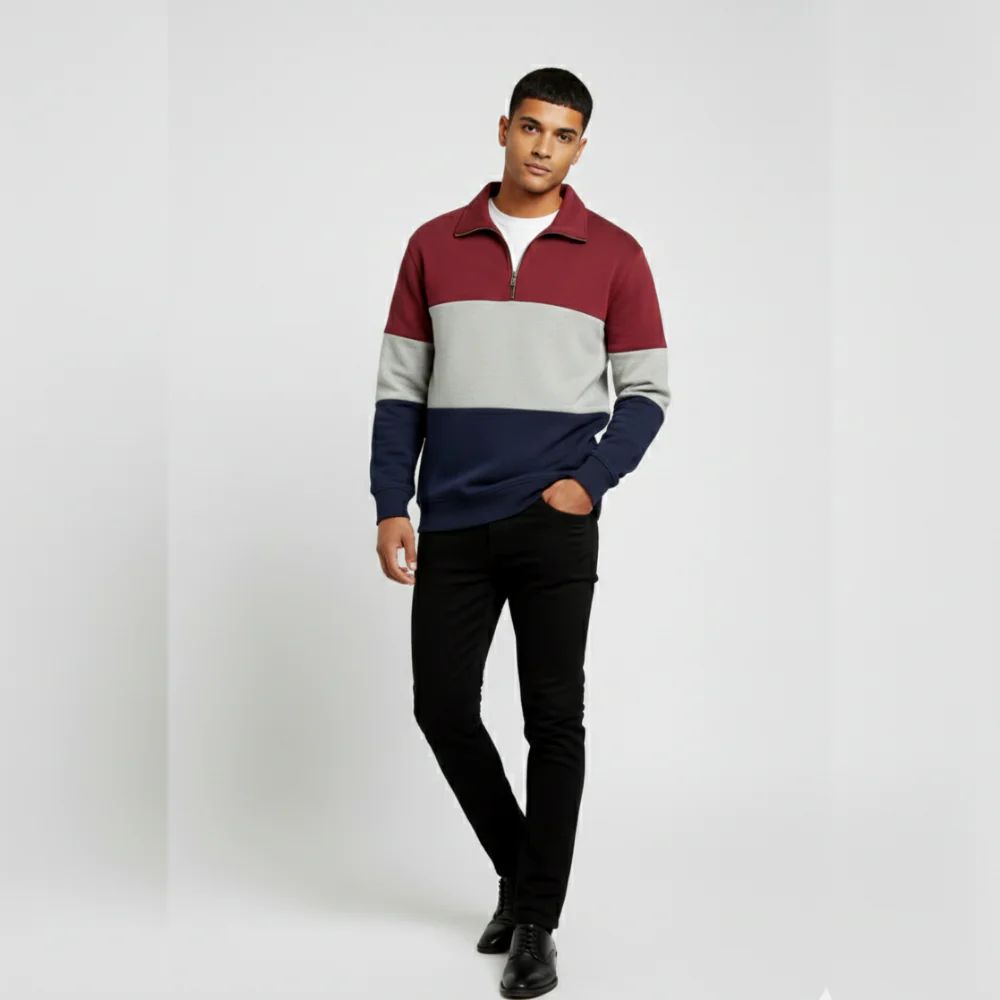 This color-block zip collar neck is made to stand out. With its striking design and rich mix of burgundy, navy, and grey. It brings instant personality to any outfit. The soft, premium fabric feels as good as it looks, while the relaxed fit gives you all-day comfort without sacrificing style.