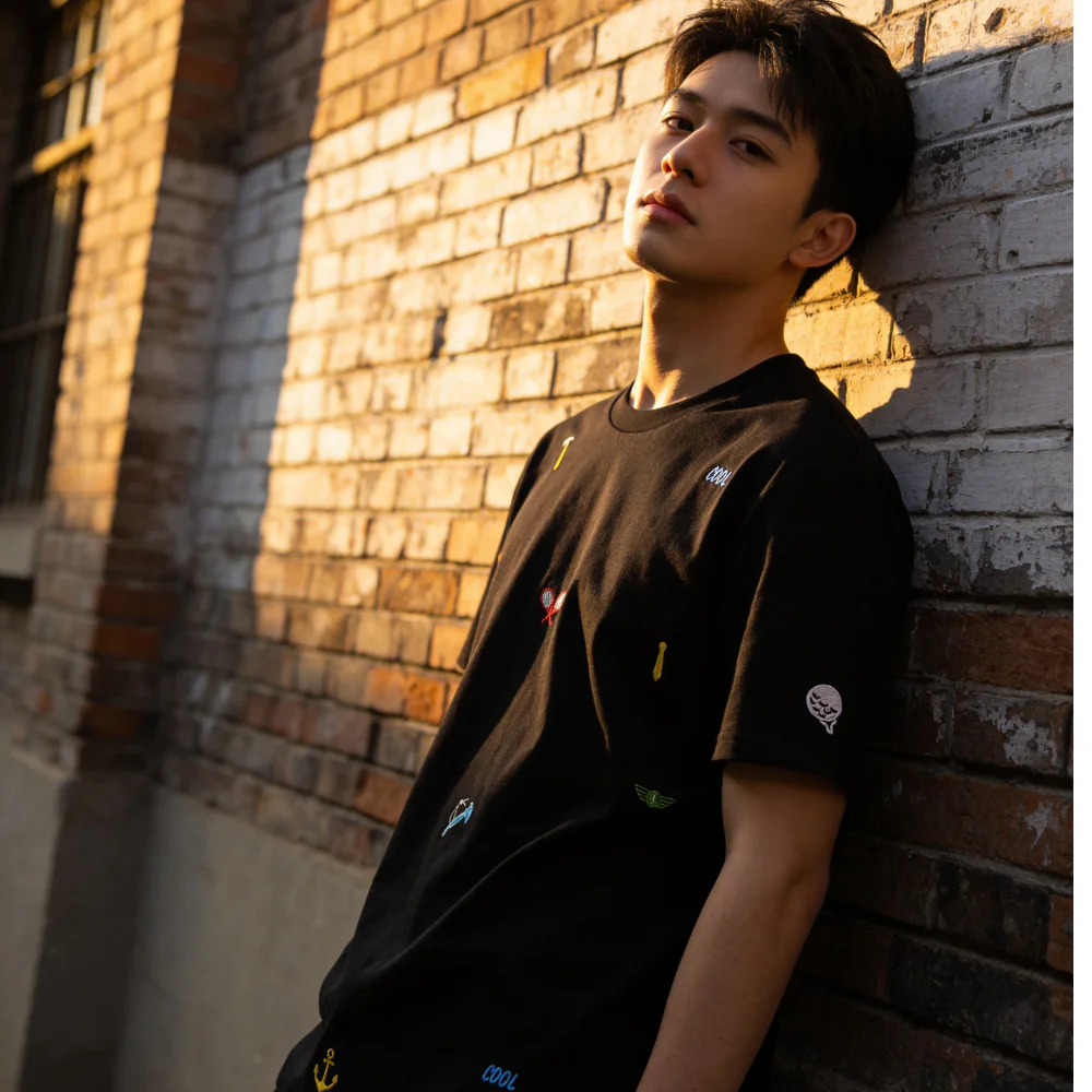 A clean, modern black crewneck featuring a unique “scatter” pattern of colorful micro-graphics. From athletic icons to nautical accents, this tee adds a subtle pop of personality to a classic silhouette.
