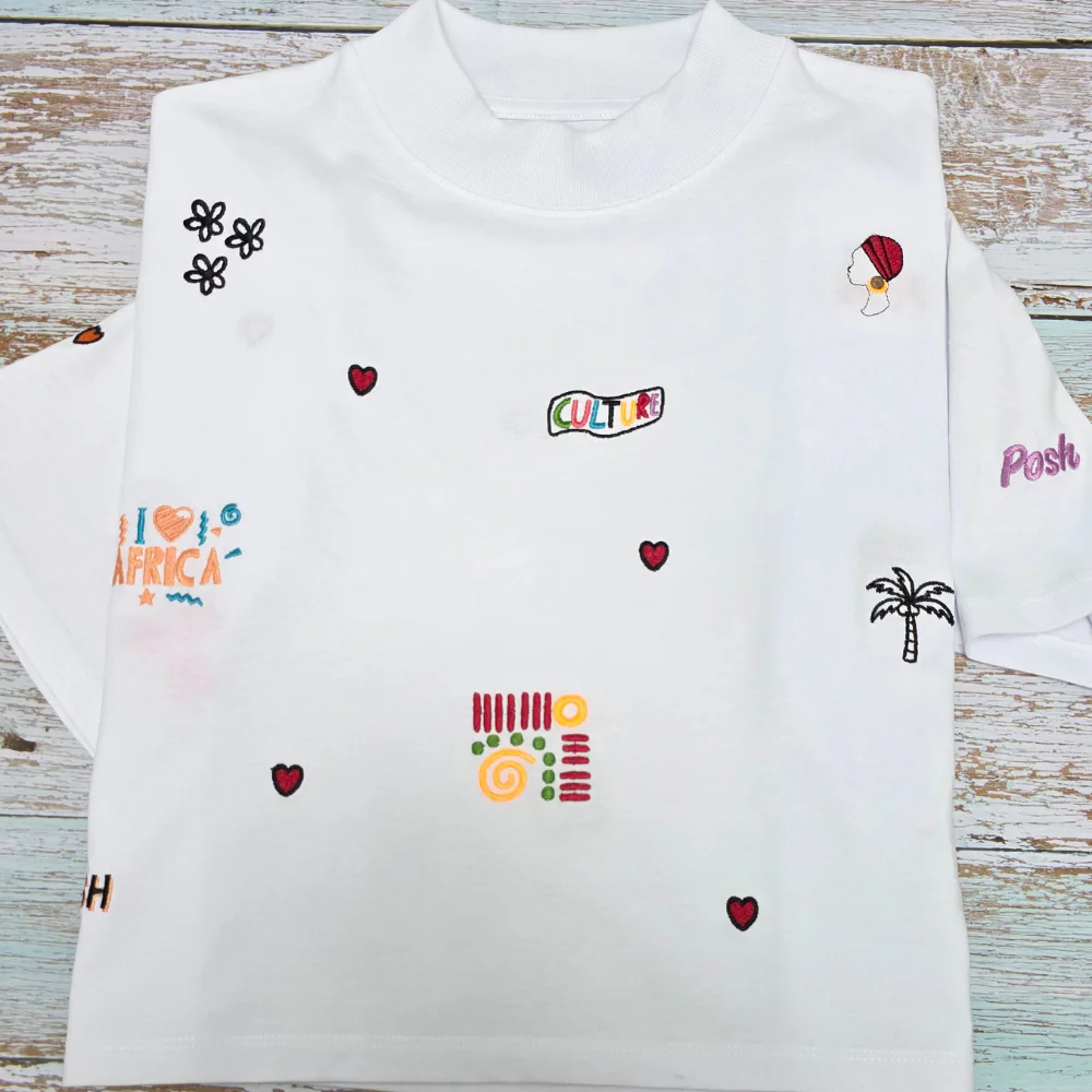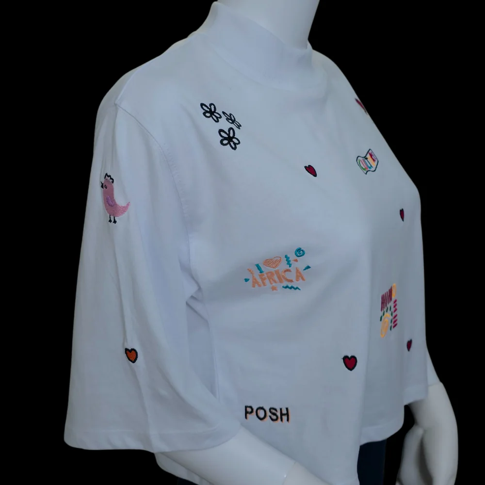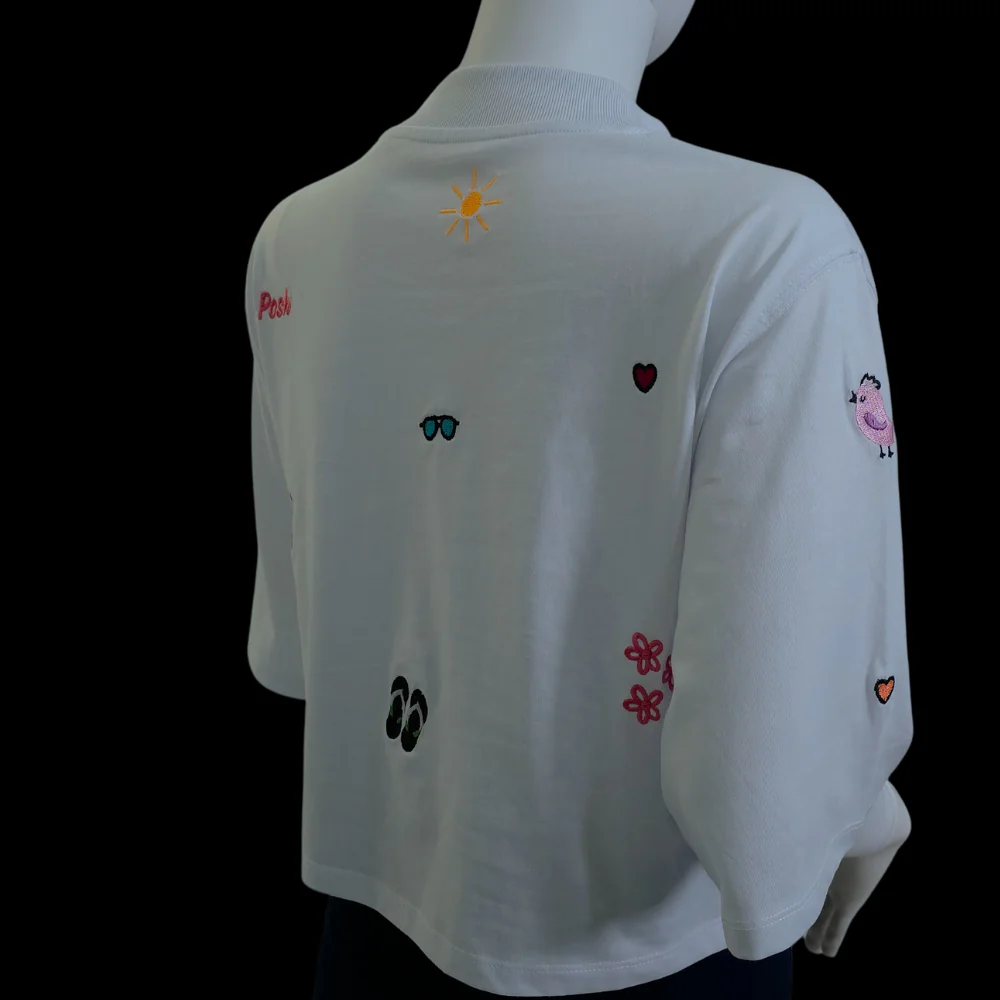 Upgrade your basics with this inspired boxed T- shirt. This structured tee features a playful mix of scattered embroidery icons and colorful doodles—for a curated, DIY aesthetic.
