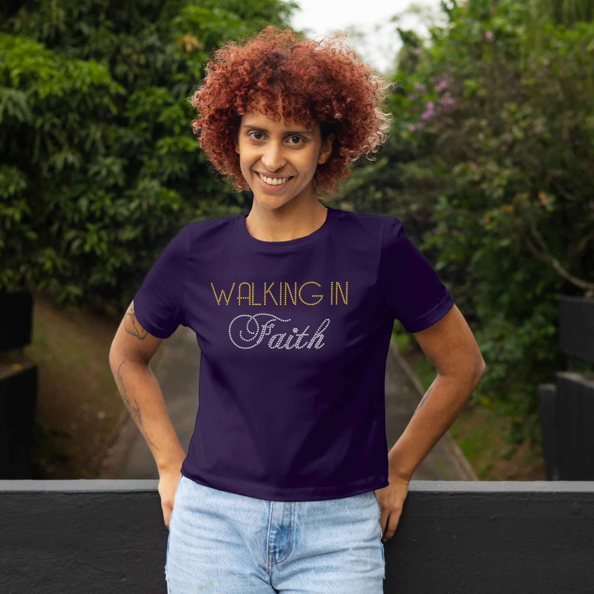 Pair it with your favorite jeans, leggings, or a skirt for a versatile and chic ensemble. The “Walking in Faith” Rhinestone T-Shirt is not just a piece of clothing; it’s a reminder to keep moving forward with unwavering faith and a fashionable flair.